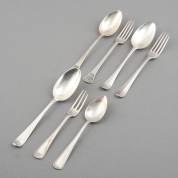 Zes 2e gehalte zilveren dinercouverts, Hollands glad, meester: Joannes Gusteloo Sr., Amsterdam, 1827, gewicht 677 gram, circa 21 cm -tanden sleets-
