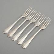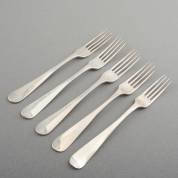 Vijf 2e gehalte zilveren dessertvorken, Hollands glad, meester: Weduwe H. Helweg & Zn, Amsterdam, 1881, gewicht 203 gram, 17,5 cm