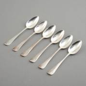Zes 2e gehalte zilveren dessertlepels, Hollands glad, meester: waarschijnlijk Peter van Gelderen, Schoonhoven, 1836, gewicht 253 gram, 19,5 cm