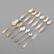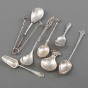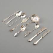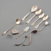 Divers zilverwerk, diverse gehaltes en meesters, waaronder: dessertlepel, twee toespijslepels, suikerschepjes en mosterdlepel, gewicht 232 gram, dessertlepel 17 cm