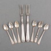 Twee 2e gehalte zilveren vleesvorkjes en zes mokkalepeltjes, parelrand, brutogewicht 79 gram, lepels 9 cm