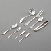 Divers 2e gehalte zilveren diengerei, voornamelijk puntfilet waaronder: notenkraker, vleesvork en sauslepel, gewicht zilver 206 gram, brutogewicht notenkraker 114 gram, vleesvork 22 cm