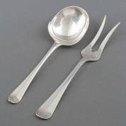 2e gehalte zilveren aardappeldienlepel, enkel lof, meester: H.W. Moolenijzer, Amsterdam, 1937, en vleesvork, Haags lof, meester: J.M. van Kempen & Zonen, Voorschoten, 1905, gewicht 181 gram, vleesvork 23 cm