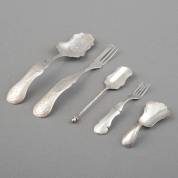 Vierdelig 3e gehalte zilveren hors d'oeuvreset, 2e gehalte zilveren lepeltje en twee zilveren potloodhouders, brutogewicht 189 gram -set gemonogrammeerd-