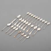 Dertien diverse 2e gehalte zilveren thee- en koffielepeltjes, en drie suikerscheppen met gravédecor waarvan één met streepagaten heft, diverse makers en jaren, gewicht zilver 84 gram, brutogewicht suikerschep met agaat 13 gram