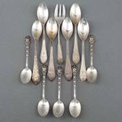 Zes 2e gehalte zilveren theelepels met gravédecor, meester: Adrianus Kuijlenburg Pz., Schoonhoven, 1861, daarbij vijf diverse 2e gehalte zilveren lepeltjes en één vorkje, gewicht 117 gram