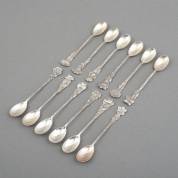 Twaalf 2e gehalte zilveren theelepels met elk een bloem op de steel, gewicht 118 gram, 11 cm