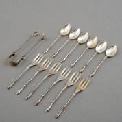 2e gehalte zilveren set van zes taartvorkjes, zes theelepels en klontjestang, alle met getorste steel, meester: J. Gelderblom, Schoonhoven, circa 1966, gewicht 134 gram, theelepel 11 cm