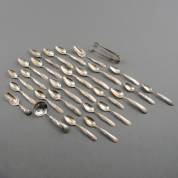 2e gehalte zilveren set van twaalf koffielepels, twaalf theelepels, theeschep, suikerschep, roomlepel en klontjestang, alle met fijn gegraveerde steel, meester: P. van Oostrom, Schoonhoven, 1965, gewicht 330 gram, lepels 13 en 11 cm