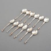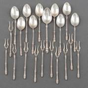 Negen 2e gehalte zilveren mokkalepeltjes, en elf zuurvorkjes met bokkenpootje, meester: J.M. van Kempen & Zonen, Voorschoten, 19e/20e eeuw, daarbij: één 2e gehalte theelepel met bokkenpootje, gewicht 100 gram, theelepel 11 cm
