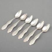 Zes 2e gehalte zilveren theelepeltjes met gegraveerde stelen, Nederland, 1869, gewicht 49 gram, 12,5 cm