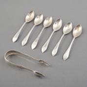 Zes zilveren theelepels, dubbel puntfilet, meesterteken: Hendrik Overhulsman, Amsterdam, 1800, waarvan één lepel meester: M.J. Nolet, Leeuwarden, 1877, daarbij: klontjestang, meester: Hendrik van der Ree, Schoonhoven, 1850, gewicht 132 gram, lepels 14 cm