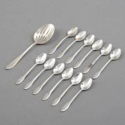 Elf 2e gehalte zilveren theelepels, theeduim en theezeefje, de geaccoleerde greep met kruisband, meester: J.M. van Kempen & Zonen, Voorschoten, 20e eeuw, gewicht 205 gram, theezeef 11,5 cm