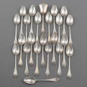 Tweeëntwintig 2e gehalte zilveren theelepels en een suikerschep met waaiermotief, meester: J.M. van Kempen & Zonen, Voorschoten, drie lepeltjes met afwijkend meesterteken, gewicht 281 gram