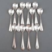 Twaalf 2e gehalte zilveren toespijslepels met gecontourneerde bakken en parelrand, meester: Van Kempen & Zonen, Voorschoten, gewicht 204 gram