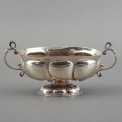 Gelobde ovale zilveren brandewijnkom, met twee grepen gevormd als draak, één zijde met inscriptie: 'F*H', twee keer geslagen met onduidelijk keur, mogelijk Noord-Duitsland, 18e eeuw, 320 gram, 12 × 25,5 × 14,5 cm -voet ingedrukt, wat ingescheurd bij grepen-