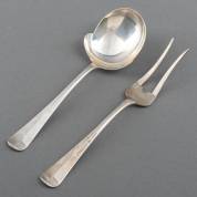 2e gehalte zilveren aardappeldienlepel en vleesvork, Haags lofje, meester: Koninklijke van Kempen en Begeer, Zeist, 1964, gewicht 147 gram, lengte vleesvork 22,5 cm