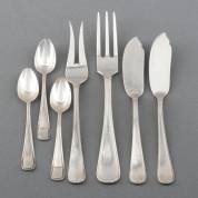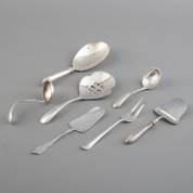 Divers 2e gehalte zilveren diengerei, diverse meesters en jaren, bestaande uit: vleesvork, kaasschaaf, sauslepel, strooilepel, taartschep, rijstschep en natfruitschep, gewicht zilver 315 gram, vleesvork 22 cm -kaasschaaf met herstelling aan schaaf en rijstschep met soldeerherstelling bij aanzet bak-