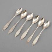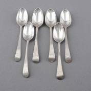 Zes 2e gehalte zilveren theelepels, met puntige empire steel en bak, vier van meester: Johannes Frijhoff, Rotterdam, 1817, gewicht 57 gram, 14 cm -één met restauratie, één met afwijkende gravering op de steel-