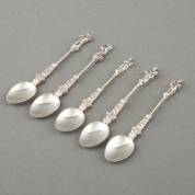 Vijf 2e gehalte zilveren apostellepeltjes met getorste steel, meester: Alle de Haas, Sneek, 20e eeuw, tevens voorzien van pseudokeuren, gewicht 74 gram, lengte 10,5 cm