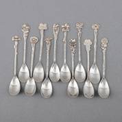 Twaalf 2e gehalte zilveren theelepels, de steel bekroond door bloemen, 10 cm, gewicht 83 gram