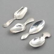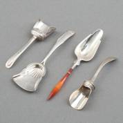 Vier 2e gehalte zilveren specerijenschepjes, één met streepagaten heft, diverse meesters en jaren, waaronder 1830, brutogewicht 32 gram, schepje met streepagaten heft 12 cm