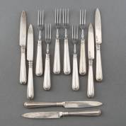 Zes 2e gehalte zilveren fruitcouverts, dubbelfilet, bestaande uit zes zilveren mesjes met zilveren lemmeten en zes vorkjes met zilveren heften, meester mesjes: Firma Roelof Citroen, 's-Gravenhage, 1925, (bruto)gewicht mesjes 208 gram, brutogewicht vorkjes, 178 gram, circa 17,5 cm