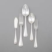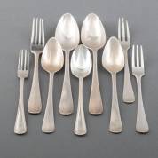 Twaalf 2e gehalte zilveren diner- en dessertcouverts, Hollands glad, in cassette, meester dinercouverts: Johannes Hendrikus Tarner, Amsterdam 1859 -één couvert met afwijkende meester en jaren-, meester dessertcouverts: Gerritsen & Van Kempen, 1953, gewicht 2450, lengte dinervork 21,5 cm -alle gemonogrammeerd EvH-