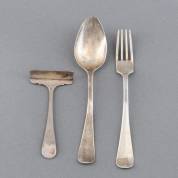 2e gehalte zilveren kindercouvert, Haags lof, voorzien van monogram en datuminscriptie, meester: J.M. van Kempen & Zonen, Voorschoten, 1892 en 1894, en 2e gehalte zilveren schuifje, parelrand, meester: Hermanus Hartman, Schoonhoven, 1889-1910, gewicht 78 gram, lepel 16 cm -couvert sleets-