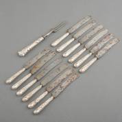 Twaalf kleine messen en een dienvork met BWZG heften met gedreven bloemdecor, gemerkt met belastingkeur voor ongewaarborgde buitenlandse werken, brutogewicht 330 gram, mes 18,5 cm -gebruikssporen en lemmeten geroest-