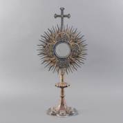 1e gehalte zilveren monstrans, gedeeltelijk verguld en gezet met diverse edelstenen, waaronder citrien en amethist, de blauw emaille band met tekst: Ecce Panis Angelorum Factus Cibus Viatorum, meester: A. Chertier, Parijs, 1819-1838, brutogewicht 1285 gram, 57 × 28 × 19 cm, in foedraal