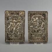 Paar verguld 2e gehalte zilveren oklad's met reliëfdecor van de kruisiging en wederopstanding, beide gemonteerd op houten paneel, twee delen van een groter geheel, Russisch, vermoedelijk 19e eeuw -ontbrekende en defecte onderdelen-, 21,5 × 13,5