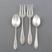 Paar 2e gehalte zilveren zuurvorkjes, en twee 2e gehalte zilveren lepeltjes, verschillend in afmeting, alle puntfilet, gewicht 106 gram, vorken 14 cm -vorken verso met familiewapen-