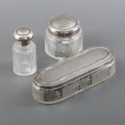 Driedelige kristallen toilettafelset, bestaande uit: wattendoos, flacon en kammendoos, met 3e gehalte zilveren dop en deksels, hoogte flacon inclusief dop 11 cm, gewicht zilver 135 gram -zilver met kleine defecten-