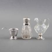 Kristallen strooibus met 2e gehalte zilveren dop, kristallen schenkkannetje op 2e gehalte zilveren voet, en 2e gehalte zilveren schaaltje, al het zilver gedecoreerd met parelrandjes, daarbij: 2e gehalte zilveren mosterdlepeltje met restauratie, gewicht zilver minimaal 80 gram, karaf 13 cm