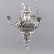 2e gehalte zilveren godslamp / nèr tamid, met drie armen, reliëfdecor van cherubijnen en acanthusbladeren, meester: Willem Baksteen & Cornelis Johannes Middendorp, Rotterdam, 1861-1889, de armen van later datum, meester: R.G.M. Arens Jr., Nijmegen, 1962, gewicht 3668 gram, 90 × Ø 50 cm -kettingen ingekort, extra delen aanwezig-