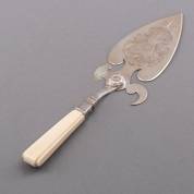 2e gehalte zilveren taartschep met rozet, ivoren greep en rocaille gravering op de schep, meester: Jacob Helweg, Amsterdam, 1841, brutogewicht 144 gram, 30 cm -CITES EU-certificaat bijgevoegd, geen uitvoer buiten de EU-