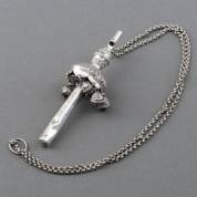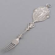 Zilveren vork, de schildvormige greep met reliëfdecor, voorzien van pseudokeuren, circa 1900, gewicht 106 gram, 29 cm