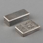 3e gehalte zilveren niëllo doosje met decor van musicerende figuren, vermeil binnenzijde, Frankrijk, 19e eeuw, en 3e gehalte zilveren niëllo doosje met vermeil binnenzijde, Frankrijk, 19e eeuw, gewicht 198 gram, grootse 2,5 × 9 × 4 cm