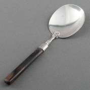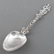 Zilveren gelegenheidslepel met getorste steel met mascaron en Caritas op de steel, voorzien van pseudokeuren, gewicht 60 gram, 19 cm