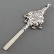1e gehalte zilveren rammelaar gedecoreerd met twee gezichten, palmetten, vier geribde bellen, fluit, en steel van kunststof, brutogewicht 38 gram, 18 cm