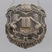 BWZG Torahschild met reliëfdecor van rocailles en gebedstafelen geflankeerd door twee leeuwen, aan ketting, gemerkt 12 Lötig, gewicht 420 gram, 30 × 25 cm