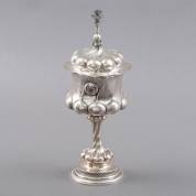 Zilveren Joodse dekselbokaal op ronde voet met gebombeerde deksel, buik en knoop, gemonteerd met Davidster, het deksel bekroond met floraal greepje, niet gemerkt, 19e eeuw, brutogewicht 441 gram, 29 × Ø 11 cm -deukjes, deksel wat verbogen en greepje met defecten-, herkomst volgens inzender: Grote Synagoge Deventer