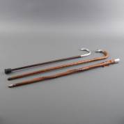 Drie houten wandelstokken met zilveren knop of greep, veelal 2e gehalte, langste stok 93 cm -gebruikssporen-