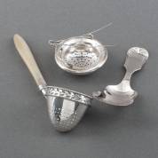 1e gehalte zilveren theezeefje met parelmoeren greep, importkeur: B. Muller, Londen, 1909, daarbij: 2e gehalte zilveren theeduim, 1873 en 2e gehalte zilveren tuitzeefje, brutogewicht 70 gram, theezeefje 13 cm