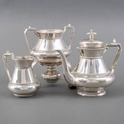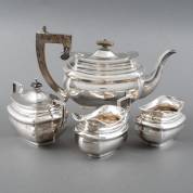 Vierdelig 1e gehalte zilveren theeservies, Birmingham, 1932, winkeliersmerk: S. Spyer, Amsterdam, bestaande uit: theepot, roomkan, suikerpot en suikerschaal, brutogewicht 1201 gram, theepot 14 × 29 × 11 cm -gebruikssporen-