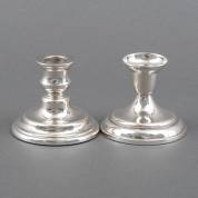 Twee 1e gehalte zilveren kandelaars waarvan één afgezet met parelrand, meester: C. Bos en Zoon, Amsterdam, 2001, de ander meester: M.C. Hersey & Son, Londen, 2000, brutogewicht 215 gram, 7 × Ø 7,5 cm