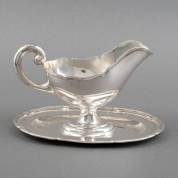 3e gehalte zilveren saucière met gecontourneerde filetrand, staand op afschroefbare onderschotel, gekeurd voor buitenlandse werken gebruikt tussen 1893-1906, gewicht 600 gram, 14 × 24 × 15 cm
