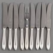 Acht fruitmesjes met 2e gehalte zilveren heft, en één vorkje, model 400 van Gustav Beran, uitvoering: Van Kempen & Begeer, Zeist, circa 1960, brutogewicht 319 gram, 17 cm