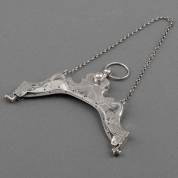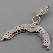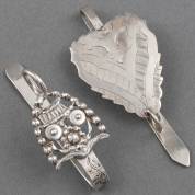 Twee 2e gehalte zilveren tashaken, het hartvormige model, meester: Gerrit van den Bergh Lz., Schoonhoven, 1876-1921, en opengewerkt schildvormig model, meester: Ernst Frans Held, Amsterdam, 1823, gewicht 33 gram